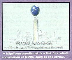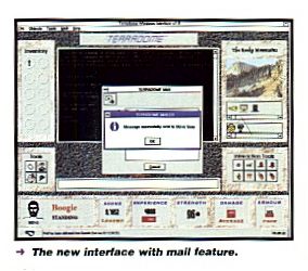 conurbation of MUDs, such as the sprawl. An example of how ambitious the new interface is, can be seen in the features which deal with communication beyond the boundaries of the single Terradome game. Although the interface is only designed to work with the Terradome game system, the aim is to encourage other groups to create alternate Terradome worlds throughout the Net and then allow players to travel between them in one big game. It will be possible to hop from one world into another, then hop back again and continue with your quest. All of this will be done without ever having to log in and out of the separate games. By this means a thousand worlds may flourish. The existing mail facility - which allows players to leave messages for each other - has been updated and included in the new interface. Not only will players now be able to mail one another within the game, the 'hooks' are in place to mail to characters in other kingdoms within the distributed Terradome worlds.