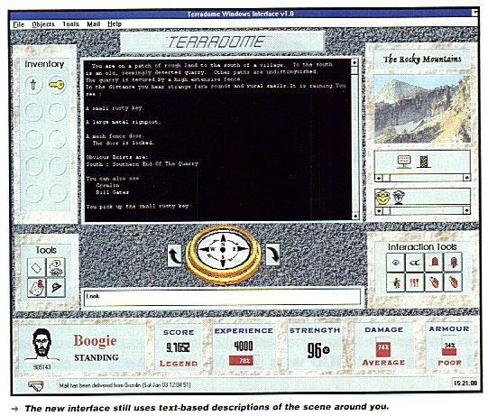 These three students, from Oxford's Brookes University, found MUDs on the network, fell in love with them, then decided to set up one of their own. The three worked on turning the basic game engine they had been given into one of Britain's few major MUDs - Terradome. Having established the game and built up an army of regular players, they then went on to spend more time than their studies should have allowed, counselling new players and acting as unpaid referees and system managers. As the game is available 24 hours a day they roped in other players from across the globe to share the responsibility. While Britain slept, players from as far away as Australia could find themselves playing a game running in Oxford, while receiving help from the duty referee in America or Norway. The original game has been available on the Net for a few years now and already it has 1500 registered users, and is growing at a rate of approximately 200 new players per week. 24 hours a day you can be sure to find up to 30 dungeoneers stumbling around its 2000 rooms, searching for the 1200 strange objects which are to be found there. The game is set amidst the traditional landscape of mountains, glaciers, castles and dark dungeons, and the players spend their leisure time carrying out quests and learning arcane spells. Playing games like these is fun enough when you are on your own, but when you can also meet and chat with other players within these magical surroundings the whole thing becomes a virtual world of possibilities. Dave McGhee - the leader of the three-man Terradome development team - decided that newcomers were being dissuaded from playing such games because of the problems caused by the confusing game commands. With this in mind, the team set out to create a front-end which would simplify things. The three guys responsible for the new look MUD are: Dave McGhee, now a network consultant for a small electronics company. Steve Gray, who is the software designer and coder of the interface, and who also works as a programmer and systems developer alongside Dave. The final main contributor is Nick jackson who is a primary school teacher, and it is his task to develop the links and hooks between the original Terradome game and the new interface. Behind these front men are a host of part-time enthusiasts who are responsible for collecting and assembling the vast number of suitable graphic images which are needed to portray the thousands of locations which make up the Terradome MUD. In the main these extra workers are regular Terradome players who have volunteered to scour the network for images which can be formed into the library of graphics required. In this way players from all over the world are contributing to the project without ever having come face to face with each other - except at the opposite end of a virtual sword! Now, after three years in development, the first Windows interface for a MUD is about to be offered to the game's users. The original game will still respond to those players who wish to continue using traditional text entry, but users of the new software will have all the comforts of a 'point-and-click' system. In addition, built-in 'hooks' will enable the GUI users to receive graphic images on their Windows-driven screens. A central panel in the middle of the display will feature the familiar text screen and this will contain the written descriptions of the location, objects which can be seen, and the conversations which are going on around you.