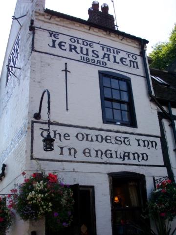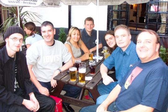 I brought some ancient MUD1 design materials with me, the first and only time I've done so (prior to sending them to Stanford University's History of Science and Technology Collections). Appropriately, we later moved on from Wetherspoons to "Ye Olde Trip to Jerusalem", the oldest inn in England. This is the first MUDmeet at which I used a digital camera, so the pictures are a bit clearer. The back fell off my old camera while I was trying to load it with new film on a train in a Welsh slate mine...