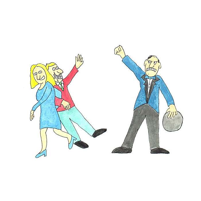 One day, the Famous Man was sitting in a restaurant with his sister. "It must be great to be famous," she said. "Everyone tries to please you, and you can do things that you could never do if you weren't famous." "It's not at all great," said the Famous Man. "It's quite the opposite, in fact. Because I'm famous, I can't do what I want to do." His sister looked around the restaurant. "But look," she said, "we're sitting at the best table and eating the best food. We couldn't sit here and eat this if you weren't famous." "I'll show you what I mean tomorrow," said the Famous Man. Next day, the Famous Man turned up at his sister's house in a taxi. "Come on!" he said. "We're taking a trip!" The taxi took them to the docks, and they boarded a big boat which sailed them to another country. "I'm not at all famous here," said the Famous Man. "Let's see how we get on." They found a restaurant, and asked for a table. "It's very busy, so you'll have to queue," said the waiter. "This wouldn't have happened if you were famous," said the Famous Man's sister, but the Famous Man just smiled. When they finally got a table, it took ages for the waiter to take their order, and even longer before he eventually brought it. But the food that was supposed to be hot was cold, and the food that was supposed to be cold was hot! Hot bananas! The Famous Man and his sister were not happy. Finally, the Famous Man could suffer no more, and he called for the manager. "This food is awful," he said. "We had to wait an hour for a seat, and the service is also very poor. Look, even my spoon is dirty!" The manager grinned, showing his horribly yellow teeth. "Well that's just hard luck for you, then, shorty, isn't it?" he said. "Don't you know who I am?" spluttered the Famous Man. "I've no idea," replied the manager. SoThe Famous Man and his sister ran away without paying.