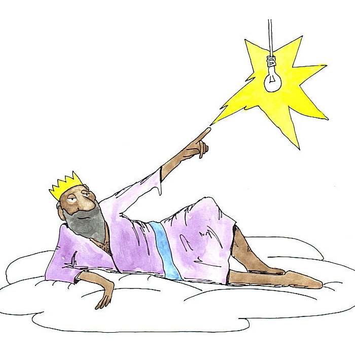 After a while, Zeus, chief of all the gods, came along to see how things were getting along. "This is very good," he said, approvingly, "except for one small thing." "What's that?" asked Aphrodite, anxiously. "Well, it's a bit dark, isn't it?" said Zeus. Aphrodite had to admit that her universe was, indeed, somewhat dim. "I can't get light to work properly," she admitted. "Why can't you make some more?" asked Zeus, but before she could answer he noticed the reason himself. "Aha, you've run out of that stuff that universes are made of. Now I wonder why that is?" "I think I may have made too many people," suggested Aphrodite. "Or spoons." Zeus shook his head. "They don't use up much at all. Time uses up the most. Tell me, how long is this universe supposed to last?" "Er, four hundred thousand million years," said Aphrodite. "Do you think that's too long?" "Way too long," laughed Zeus. "You only want it half that, at most. I can tell you're going to have to wind your clock back a bit." "But that'll take me ages," said Aphrodite, sadly. "It was bad enough winding it forward. Is there no way I can do it quicker?" "Of course," smiled Zeus. "We old gods do know a trick or two that aren't in the book. What we usually do in cases like this is to borrow the hands off clocks from other universes, and put them all on this universe's clock. Then, we all work together to move the hands all back at once. If, say, ten of us each took a hand from one of our own universes, we could turn your time back into universe-building stuff ten times quicker." "And then I'll have enough of it around to use for light!" clapped Aphrodite. SoMany hands make light work.