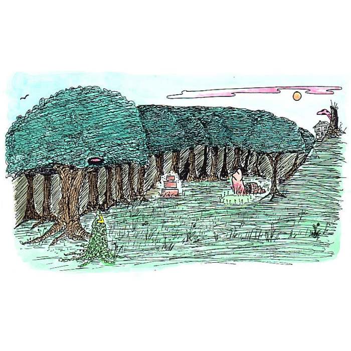 In the middle of the sleepy, blue lake is a secret island. On the secret island is a wood, full of leafy trees. Standing in the wood is a tall oak tree, much older than all the other trees, and far grander. On one of the lower branches of the tall oak tree, about half-way along, is a magpie's nest containing a silver spoon (which the magpie has stolen). On the ground directly beneath the magpie's nest is a stone sundial, covered in ivy. Not far from the stone sundial is a beehive. If you stand at the stone sundial and look towards the beehive, a little way beyond it you'll see a small glade. At one end of the small glade, in the shade of a holly tree, is a fairy ring. Close to the fairy ring is a patch of tiny, scarlet flowers. The tiny, scarlet flowers grow up against the front of a large, grey rock. On the other side of the large, grey rock is a barrel, which has fallen to pieces. The barrel fell to pieces when it hit the large, grey rock after rolling down a gentle slope. You can see the gentle slope from the top of the large, grey rock. If you climb the gentle slope, you'll find a weathered tree stump. Growing on the tree weathered tree stump is an enormous toadstool. And underneath the enormous toadstool is the home of the elf! SoIf you want to write a letter to the elf, always turn the envelope length-ways first...